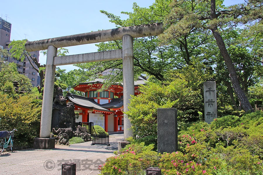 こちらが千葉神社の正面境内入口で、鳥居と社号標が参拝者を迎えてくれます。
